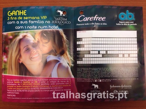 Encontrei este RSF no Continente. A Carefree e O.B oferecem 40 bilhetes para o jardim zoológico de Lisboa, e 3 fins-de-semana Vip num hotel. Juntam os códigos de barras de 2 embalagens, e escrevem uma frase, até 27 Setembro