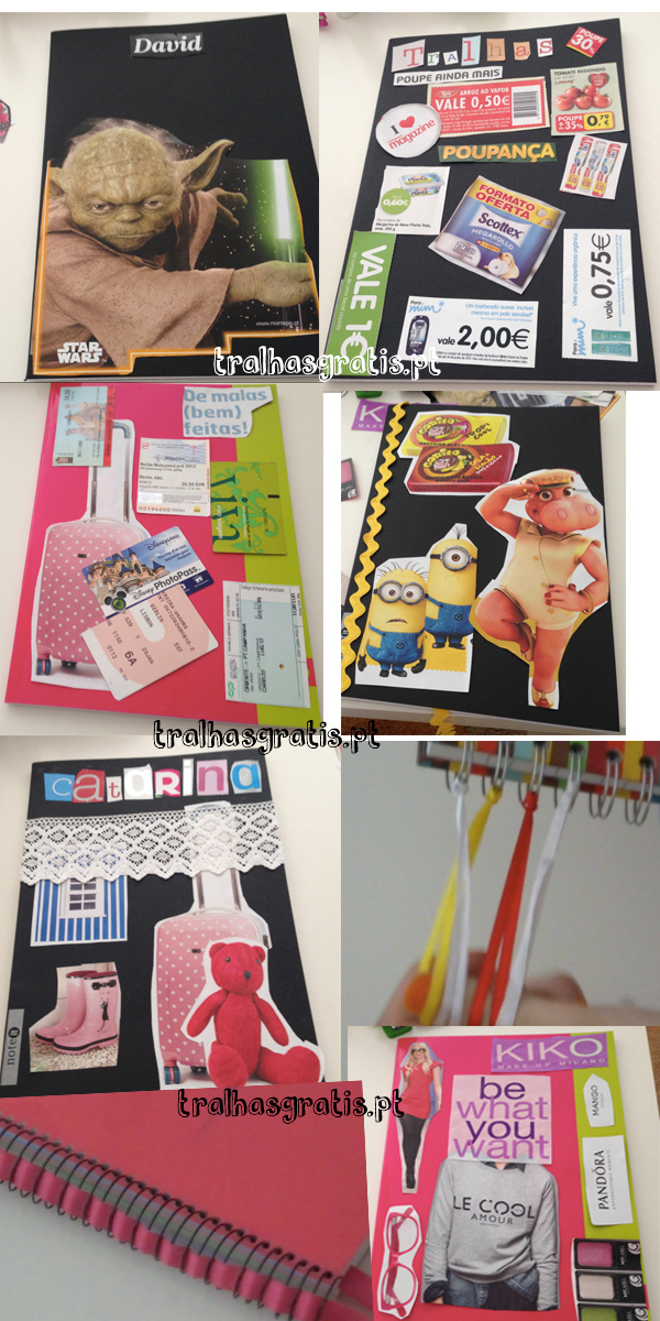 A imaginação é o limite! Podem sempre colocar papel transparente depois de fazerem as colagens para durar mais tempo! Deixo aqui algumas fotografias do que fiz, e de outras sugestões! Utilizei os cadernos pretos, e um cor-de-rosa que comprei no Continente. Também dou indicações para cadernos de argolas!